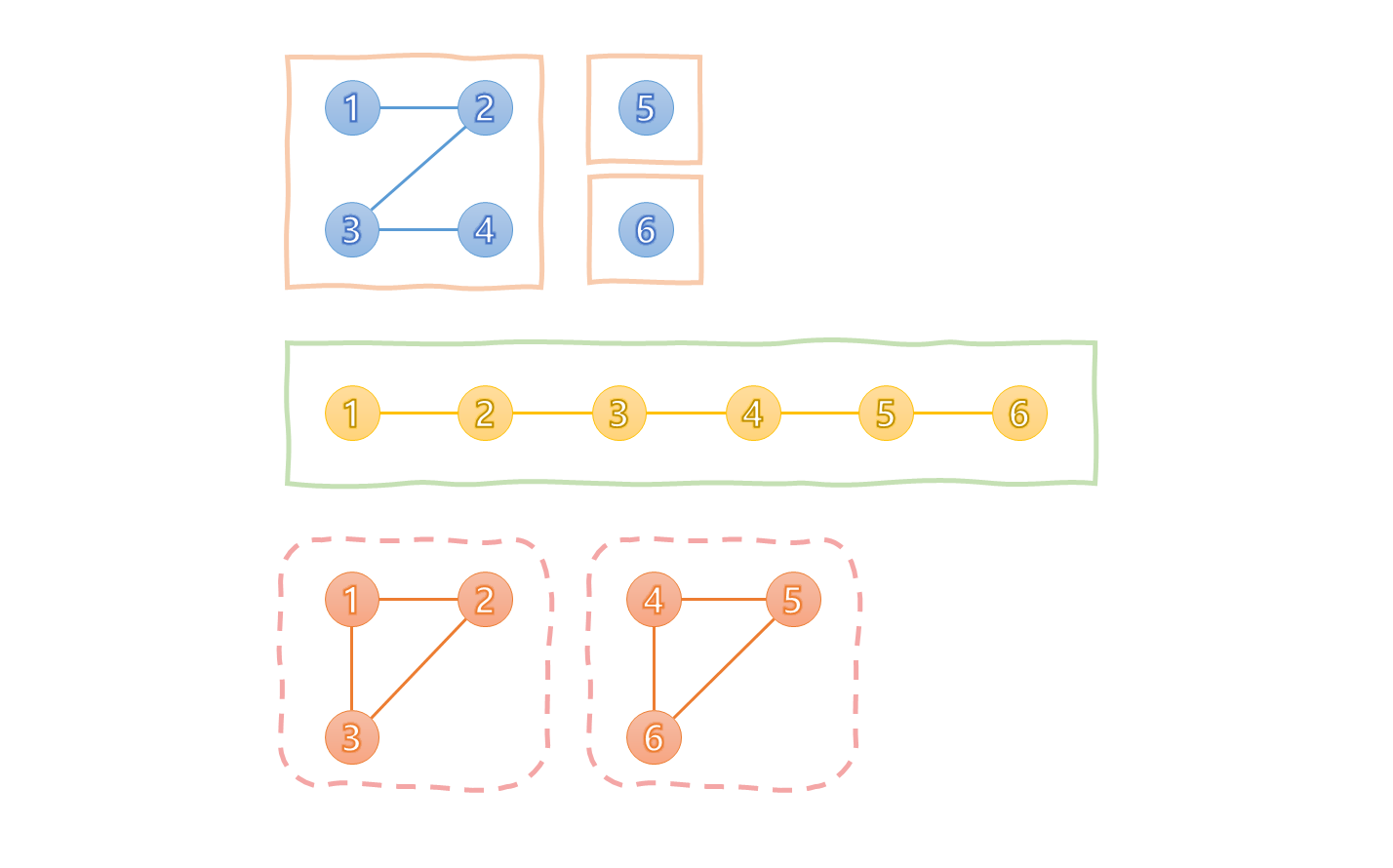 단, 주의해야하는 점은 예제로 주어진 입력과 같이 주어지는 간선정보에 포함되지 않은, 다른 노드와 연결되지 않은 노드들도 존재한다는 것이며 이런 노드들도 각각 노드가 하나인 트리로 카운트해주어야 한다는 점이다.